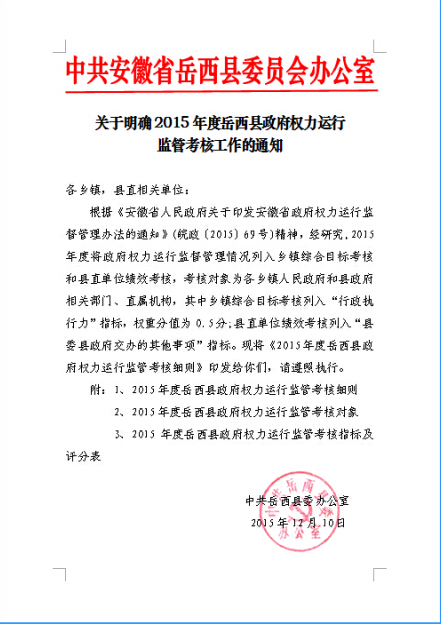为加强政府权力运行监督管理,促进县政府各部门、各乡镇依法、规范行使权力,推进法治政府建设。近日,岳西县委办公室下发《关于明确2015年度岳西县政府权力运行监管考核工作的通知》,同时印发了《2015年度岳西县政府权力运行监管考核细则》,明确自2015年起将政府权力运行监管工作纳入各乡镇年度目标考核和县直有关单位年度绩效考核。