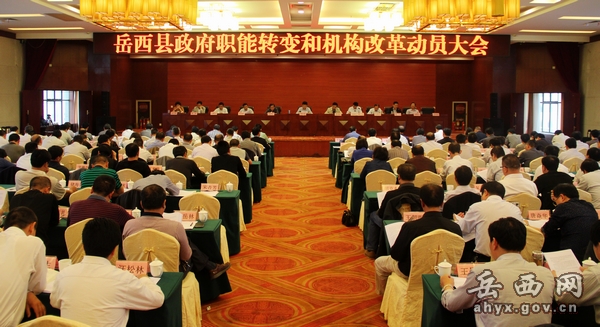 5月5日,岳西县召开政府职能转变和机构改革动员大会,正式启动县政府职能转变和机构改革工作。县委书记周东明出席会议并作重要讲话。县领导储诚根、程首初、郭中、李昌群、江春生、王彰平、程谦、徐昭、储耀华、余巧萍、方绍武出席会议并在主席台就坐。