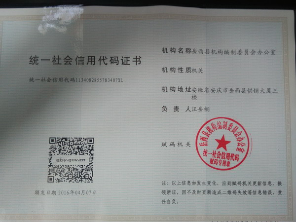 全市机关、编办直接管理机构编制的群众团体统一社会信用代码赋码工作培训会议结束后,岳西县编办迅速开展业务学习,熟悉系统操作,征订证书等。在做好前期准备工作之后,4月8日,县事业单位登记管理局通过中央编办网上赋码和事业单位网上登记管理系统,对bet365首页统一信用代码相关信息进行录入,同时打印出我县首张机关统一社会信用代码证。